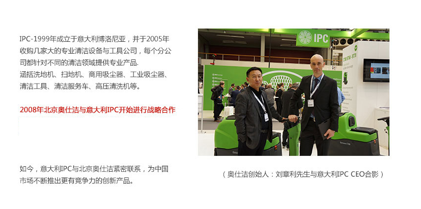 北京奧仕潔 清潔設(shè)備有限公司(簡(jiǎn)稱奧仕潔 )成立于2001年,是國(guó)內(nèi)較早進(jìn)口清潔設(shè)備服務(wù)商之一,二十年發(fā)展中,已然成為三大國(guó)際品牌代理,分別意大利IPC清潔設(shè)備,意大利KEVAC工業(yè)吸塵器,德國(guó)WEIDINER高壓清洗機(jī),為了解決各種不同的環(huán)境清潔問題,奧仕潔目前整合了國(guó)內(nèi)外知名廠商的商業(yè)清潔設(shè)備、工業(yè)清洗設(shè)備、清潔藥劑、高空升降設(shè)備等系列清潔服務(wù)類設(shè)備,專業(yè)提供一站式清潔系統(tǒng)解決方案。