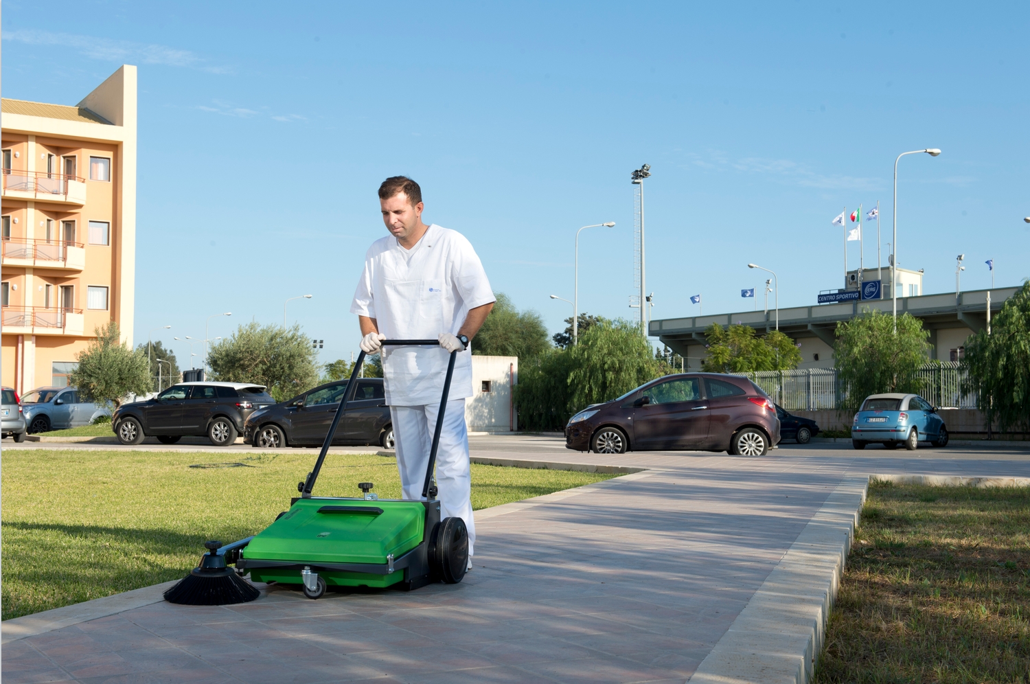 2、IPC手推式掃地機(jī)、造型新穎、使用方便、綠色環(huán)保、節(jié)能高效,清掃效率是傳統(tǒng)人工掃帚的4-6倍,特別適合清掃街道、小區(qū)、公園、庭院、學(xué)校、車間、庫房以及大型活動場館等不宜使用動力驅(qū)動型清掃設(shè)備的場所。